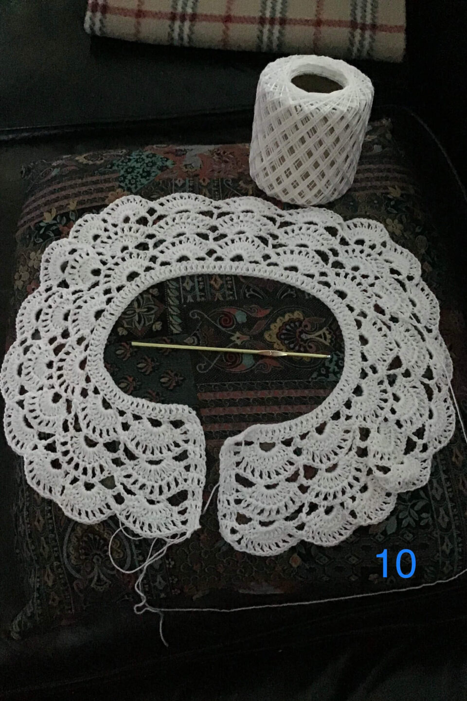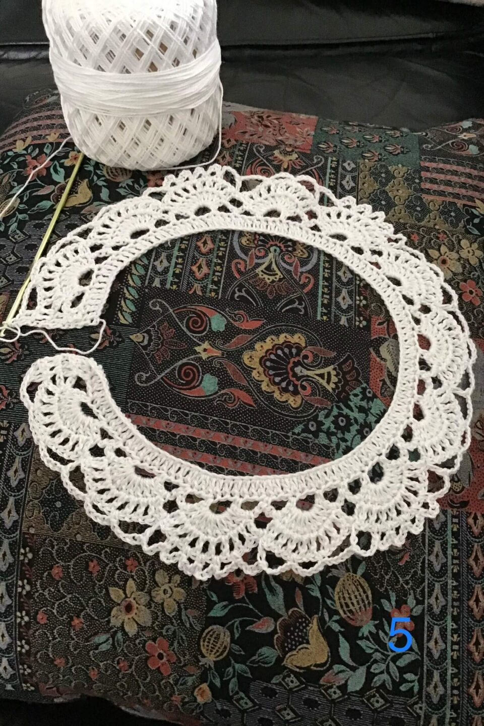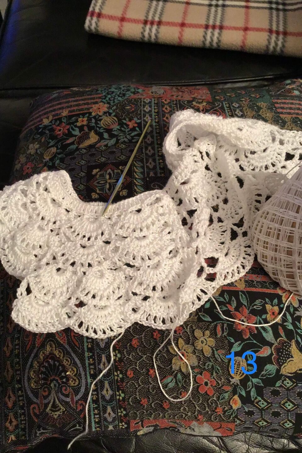 3 catenelle (=1 maglia alta), 2 maglie alte, 5 catenelle, 1 maglia bassa sull’archetto tra la terza e la quarta maglia alta del ventaglietto sottostante, 5 catenelle, 1 maglia bassa sull’archetto tra la quinta e la sesta maglia alta del ventaglietto sottostante, 5 catenelle, 1 maglia alta sulla maglia bassa tra i due ventaglietti; ripetere su tutti i ventaglietti del giro ad eccezione del terzo, quinto, nono e undicesimo ventaglietto in cui andremo ad effettuare la base per la duplicazione del ventaglietto al fine di allargare lo sprone e dare la forma delle spalle; sui ventaglietti sopra detti lavorare: 5 catenelle, 1 maglia bassa sull’archetto tra la seconda e la terza maglia del ventaglietto successivo, 5 catenelle, 1 maglia bassa nell’archetto successivo, 5 catenelle, una maglia bassa nell’archetto successivo, ancora 5 catenelle e 1 maglia bassa nell’archetto successivo; terminare con 3 maglie alte e voltare il lavoro