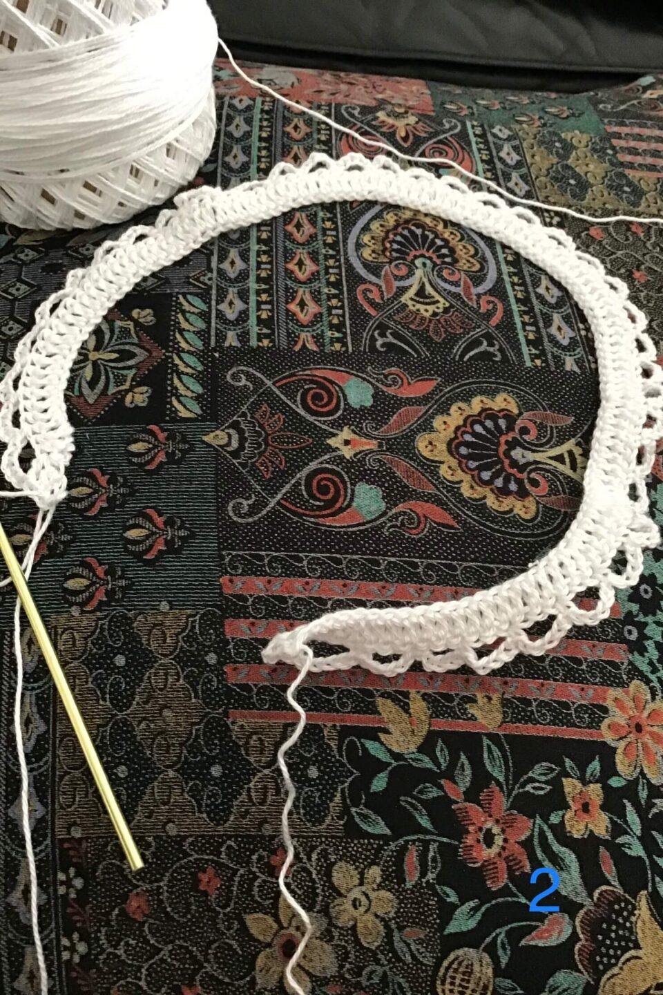 3 catenelle (=1 maglia alta), 2 maglie alte, 3 catenelle, 1 maglia bassa al centro del primo archetto sottostante, *8 maglie alte nell’archetto successivo, 1 maglia bassa al centro dell’archetto successivo, 5 catenelle, 1 maglia bassa nell’archetto successivo*; continuare da * a * fino alla fine è completare il giro con 3 catenelle e 3 maglie alte; a fine giro avremo realizzato 13 ventaglietti intervallati da archetti di catenelle; voltare il lavoro